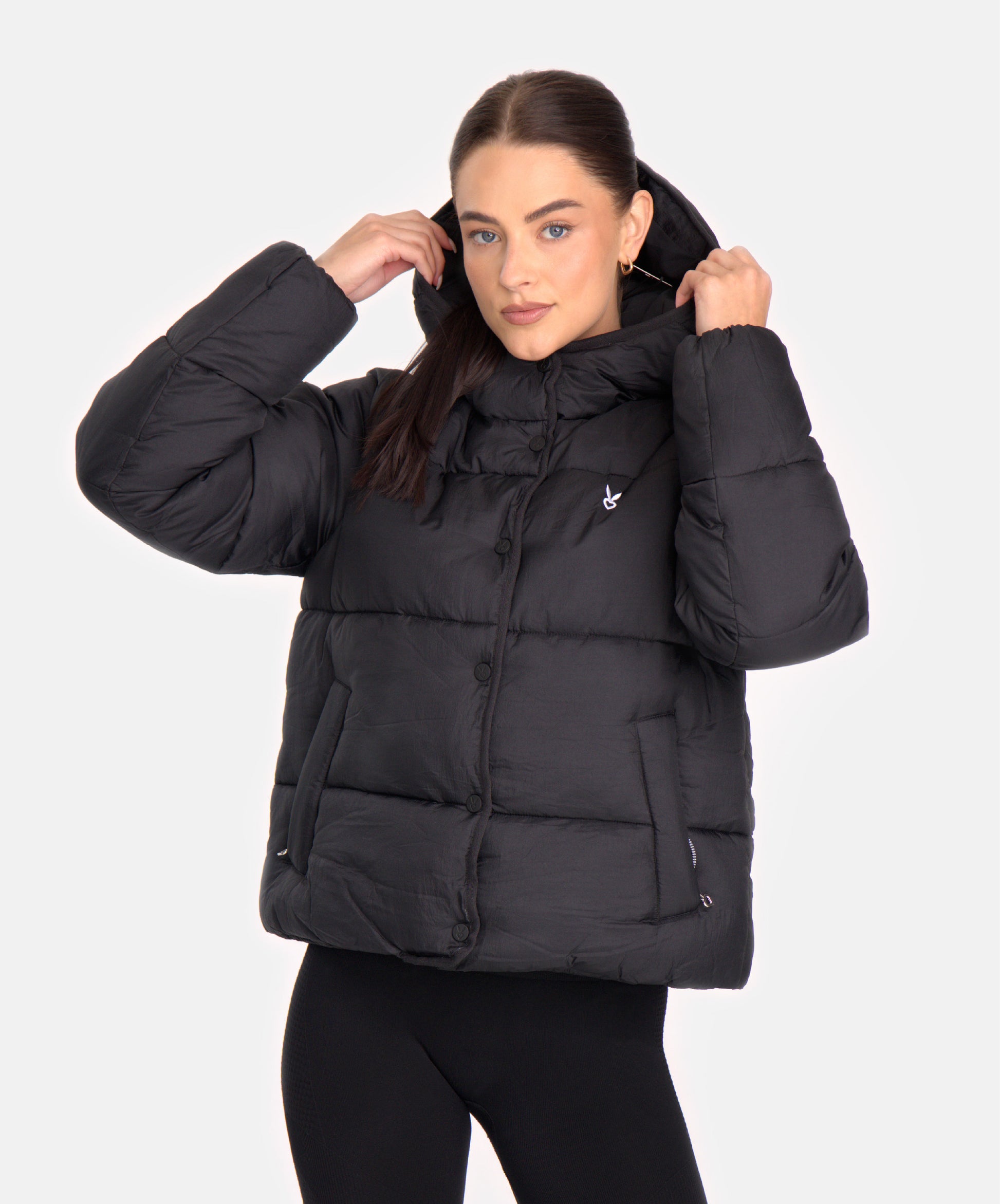Cuenta con capucha integrada para mayor cobertura, cierre frontal con botones a presión y bolsillos laterales funcionales. Su acabado mate y el logo Cardio Bunny discreto elevan esta prenda a un básico imprescindible del guardarropa athleisure.